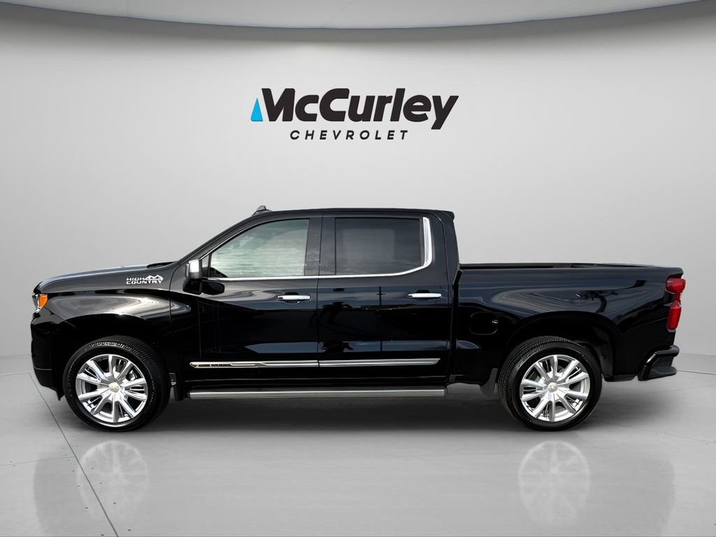 2022 Chevrolet Silverado 1500 High Country 4WD 10-Speed Automatic EcoTec3 5.3L V8 Black McCurley Certified + Certified, 10-Speed Automatic, 4WD, Jet Black/Nightshift Blue Leather, 10-Way Power Driver Seat w/Lumbar, 10-Way Power Passenger Seat Adjuster w/Lumbar, 12.3 Multicolor Reconfigurable Digital Display, 120-Volt Bed Mounted Power Outlet, 120-Volt Instrument Panel Power Outlet, 2 USB Data Ports, 2nd Row Heated Outboard Seats, All-Weather Floor Liner (LPO), Auto-Dimming Inside Rear-View Mirror, Auto-Locking Rear Differential, Bed View Camera, Bluetooth® For Phone, Body-Color Painted Mirror Caps, Chevrolet Connected Access Capable, Chevytec Spray-On Black Bedliner, Chrome Assist Steps, Chrome Recovery Hooks, Color-Keyed Carpeting Floor Covering, Compass, Deep-Tinted Glass, Driver Memory, Dual Exhaust w/Polished Outlets, Dual Rear USB Ports (Charge Only), Electric Rear-Window Defogger, Electrical Steering Column Lock, Electronic Cruise Control, Floor Mounted Center Console, Front Carpeted Floor Mats, Front LED Fog Lamps, Front Rainsensing Wipers, HD Surround Vision, Heated Driver & Front Outboard Passenger Seats, Heated Steering Wheel, High Capacity Suspension Package, High Country Premium Package, Hitch Guidance, Hitch Guidance w/Hitch View, Integrated Trailer Brake Controller, Keyless Open & Start, Leather Wrapped Steering Wheel, LED Cargo Area Lighting, OnStar & Chevrolet Connected Services Capable, Outside Heated Power-Adjustable Mirrors, Perimeter Lighting, Power Front Passenger Windows w/Express Up/Down, Power Front Windows w/Driver Express Up/Down, Power Rear Windows w/Express Down, Power Sliding Rear Window w/Rear Defogger, Power Sunroof, Power Tailgate, Power Tilt & Telescoping Steering Column, Preferred Equipment Group 3LZ, Rear Carpeted Floor Mats, Rear Cross Traffic Alert-Braking, Rear Pedestrian Detection, Rear Wheelhouse Liners, Remote Vehicle Starter System, Safety Alert Seat, SiriusXM w/360L, Standard Tailgate, Steering Wheel Audio Controls, Theft Deterrent System (Unauthorized Entry), Trailer Camera Provisions, Trailer Side Blind Zone Alert, Trailering App, Trailering Package, Ultrasonic Front & Rear Park Assist, Universal Home Remote, Up-Level Rear Seat w/Storage Package, Ventilated Driver & Front Passenger Seats, Wheels: 22 x 9 Painted Aluminum, Wi-Fi Hot Spot Capable, Wireless Charging, Wireless Phone Projection, 170 Amp Alternator, 3.23 Rear Axle Ratio, 4-Wheel Disc Brakes, 7 Speakers, ABS brakes, Adaptive Ride Control Suspension, Air Conditioning, Alloy wheels, AM/FM radio: SiriusXM with 360L, Apple CarPlay/Android Auto, Auto High-beam Headlights, Auto-dimming door mirrors, Auto-dimming Rear-View mirror, Automatic Emergency Braking, Automatic temperature control, Bodyside moldings, Brake assist, Bumpers: body-color, Delay-off headlights, Driver door bin, Driver vanity mirror, Dual front impact airbags, Dual front side impact airbags, Electronic Stability Control, Electronic Transmission Range Selector Shifter, Engine Block Heater, Following Distance Indicator, Forward Collision Alert, Front anti-roll bar, Front Bucket Seats, Front Center Armrest, Front dual zone A/C, Front fog lights, Front License Plate Kit, Front Pedestrian Braking, Front reading lights, Front wheel independent suspension, Fully automatic headlights, Garage door transmitter, Genuine wood console insert, Genuine wood dashboard insert, Genuine wood door panel insert, Heated door mirrors, Heated front seats, Heated rear seats, Heated steering wheel, Illuminated entry, IntelliBeam Automatic High Beam On/Off, Lane Keep Assist w/Lane Departure Warning, Low tire pressure warning, Memory seat, Not Equipped w/Dynamic Fuel Management, Not Equipped w/Front & Rear Park Assist, Occupant sensing airbag, Outside temperature display, Overhead airbag, Overhead console, Panic alarm, Passenger door bin, Passenger vanity mirror, Perforated Le
