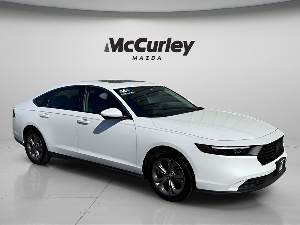 2024 Honda Accord EX Certified.2024 Honda Accord EX FWD CVT 1.5T I4 DOHC 16V Turbocharged VTEC Platinum White Pearl McCurley Certified + Certified, Black w/Fabric Seat Trim, 4-Wheel Disc Brakes, 8 Speakers, ABS brakes, Adaptive Cruise Control: Adaptive Cruise Control (ACC) with Low-Speed Follow, Air Conditioning, Alloy wheels, AM/FM radio, Apple CarPlay/Android Auto, Auto High-beam Headlights, Auto-dimming Rear-View mirror, Automatic temperature control, Blind Spot Information (BSI) System warning, Brake assist, Bumpers: body-color, Compass, Delay-off headlights, Driver door bin, Driver vanity mirror, Dual front impact airbags, Dual front side impact airbags, Electronic Stability Control, Emergency communication system: HondaLink Assist, Exterior Parking Camera Rear, Fabric Seat Trim, Four wheel independent suspension, Front anti-roll bar, Front Bucket Seats, Front Center Armrest, Front dual zone A/C, Front reading lights, Fully automatic headlights, Heated Front Bucket Seats, Heated front seats, Illuminated entry, Knee airbag, Lane departure: Lane Keeping Assist System (LKAS) active, Low tire pressure warning, Occupant sensing airbag, Outside temperature display, Overhead airbag, Overhead console, Panic alarm, Passenger door bin, Passenger vanity mirror, Power door mirrors, Power driver seat, Power moonroof, Power steering, Power windows, Radio data system, Radio: 180-Watt AM/FM Audio System, Rear anti-roll bar, Rear reading lights, Rear seat center armrest, Rear side impact airbag, Rear window defroster, Remote keyless entry, Security system, Speed control, Speed-sensing steering, Speed-Sensitive Wipers, Split folding rear seat, Steering wheel mounted audio controls, Tachometer, Telescoping steering wheel, Tilt steering wheel, Traction control, Trip computer, Variably intermittent wipers, Wheels: 17 x 7.5 Pewter Gray, Black w/Fabric Seat Trim.Certification Program Details: This vehicle is McCurley Certified+ and includes: -5 Year / 100k Mile Powertrain Warranty* -Engine, Drive Assembly, Transmission, Seals and Gaskets Coverage* -102pt Mechanical & Appearance Inspection -McCurley Advantage- Repel Shield, Loyalty Rewards, Owner App -$0 Warranty Deductible -7 Day / 500 Mile Exchange Policy* -Certified Value Market Based Pricing -3 Month / 3000 Mile Limited Comprehensive Warranty* -Emergency Roadside Service -Rental Vehicle, Towing, Travel & Lodging Reimbursement -Tire Coverage *See dealer for complete coverage details. Coverage may vary by vehicle and mileage.Odometer is 8414 miles below market average! 29/37 City/Highway MPG