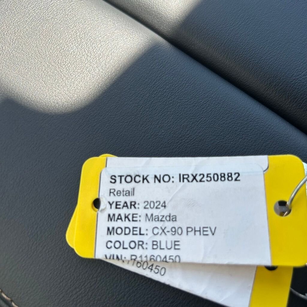 2024 Mazda CX-90 PHEV Preferred Certified.2024 Mazda CX-90 PHEV Preferred AWD 8-Speed Automatic 2.5L I4 DOHC 16V LEV3-SULEV30 Deep Crystal Blue Mica Mazda Certified Pre-Owned Certified, 2nd-Row Captain's Chairs, 3rd row seats: bench, 4-Wheel Disc Brakes, 4.444 Axle Ratio, 8 Speakers, ABS brakes, Air Conditioning, Alloy wheels, AM/FM radio, AppLink/Apple CarPlay and Android Auto, Auto High-beam Headlights, Automatic temperature control, Brake assist, Bumpers: body-color, Compass, Delay-off headlights, Driver door bin, Driver vanity mirror, Dual front impact airbags, Dual front side impact airbags, E911 Automatic Emergency Notification, Electronic Stability Control, Emergency communication system: MAZDA CONNECT, Exterior Parking Camera Rear, Four wheel independent suspension, Front anti-roll bar, Front Bucket Seats, Front Center Armrest w/Storage, Front dual zone A/C, Front reading lights, Fully automatic headlights, Heated door mirrors, Heated Front Bucket Seats, Heated front seats, Illuminated entry, Infotainment System Voice Command, Knee airbag, Leather Seat Trim, Leather Shift Knob, Leather steering wheel, Low tire pressure warning, Mazda Connected Services, Occupant sensing airbag, Outside temperature display, Overhead airbag, Overhead console, Pandora Internet Radio Integration, Panic alarm, Passenger door bin, Passenger vanity mirror, Power door mirrors, Power driver seat, Power Liftgate, Power moonroof, Power passenger seat, Power steering, Power windows, Radio Broadcast Data System Program Information, Radio data system, Radio: AM/FM w/HD/8-Speakers, Rain sensing wipers, Rear air conditioning, Rear anti-roll bar, Rear reading lights, Rear seat center armrest, Rear window defroster, Rear window wiper, Remote keyless entry, SMS Text Msg Audio Delivery & Reply, Speed control, Speed-sensing steering, Split folding rear seat, Spoiler, Steering wheel mounted audio controls, Tachometer, Telescoping steering wheel, Tilt steering wheel, Traction control, Trip computer, Turn signal indicator mirrors, Variably intermittent wipers, Wheels: 19 x 8.5J Aluminum Alloy.Mazda Certified Pre-Owned Details:* Includes Autocheck Vehicle History Report with 3 Year Buyback Protection. 3 month SiriusXM trial subscription.* Powertrain Limited Warranty: 84 Month/100,000 Mile (whichever comes first) from original in-service date* Roadside Assistance* 160 Point Inspection* Limited Warranty: 12 Month/12,000 Mile (whichever comes first) after new car warranty expires or from certified purchase date* Warranty Deductible: $0* Transferable Warranty* Vehicle HistoryOdometer is 13283 miles below market average!
